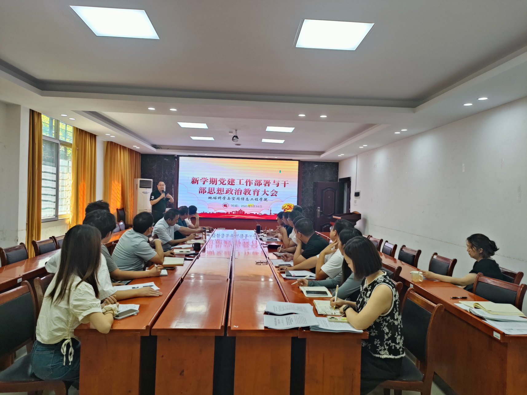 2025年9月16日,地球科学与空间信息工程学院在地学楼206会议室召开2025年秋季新学期党建工作部署与干部思想政治教育大会。学院党委书记龙四春主持学习会议。学院全体院领导,地理空间信息技术国家地方联合工程实验室副主任、院师生党支部书记、党政办主任、组织员参加本次会议。