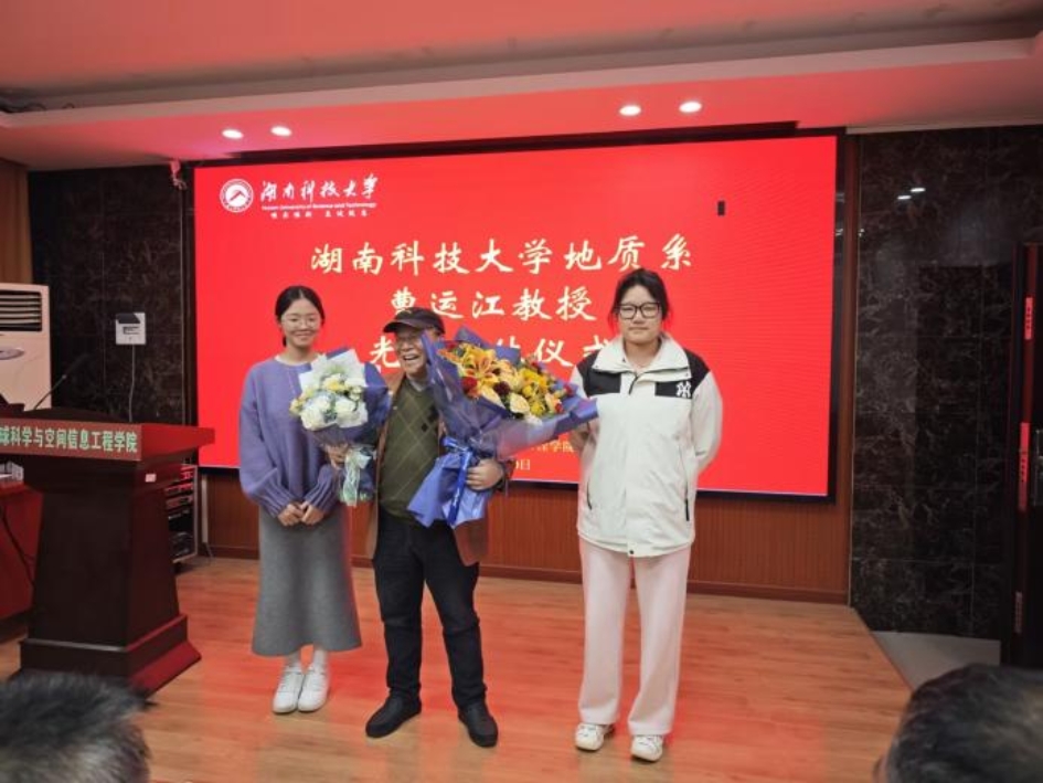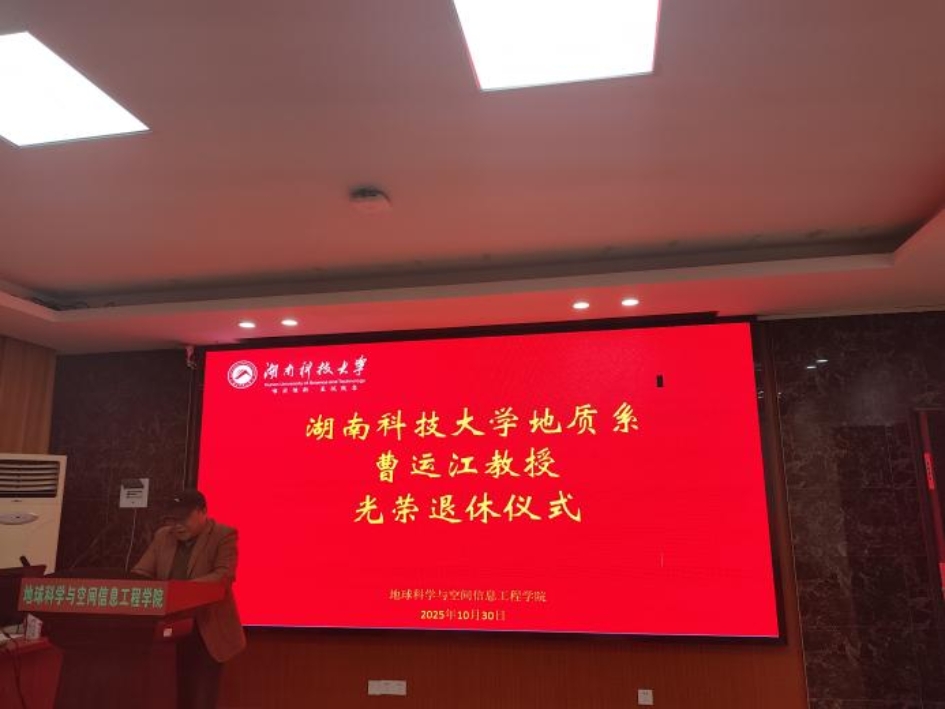 2025年10月30日,湖南科技大学地球科学与空间信息工程学院为地质系曹运江教授举办了一场温馨而庄重的荣退仪式。学院领导、师生代表齐聚一堂,共同见证这位执教三十八载、桃李满天下的教育者告别讲台的荣耀时刻。仪式通过领导致辞、学生感恩、师生献花及曹教授“上善若水”主题讲话等环节,展现了师者风范与学术精神的传承。