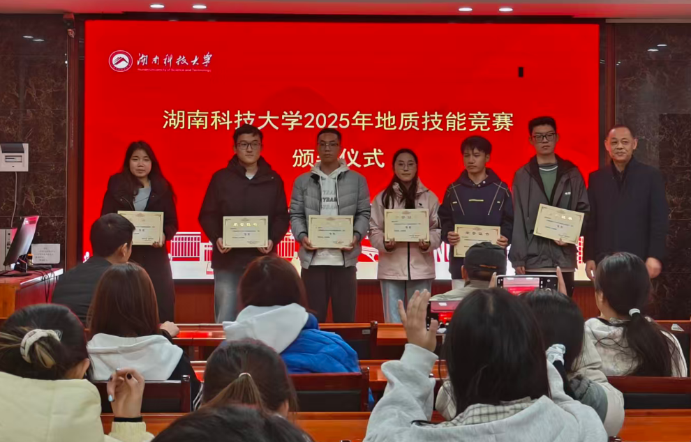 12月17日晚,湖南科技大学2025年地质技能竞赛颁奖仪式在地学楼206会议室顺利举行。地球科学与空间信息工程学院院长朱永建、党委副书记崔皓、地质系副主任廖晶及地质系部分专业老师参加。
