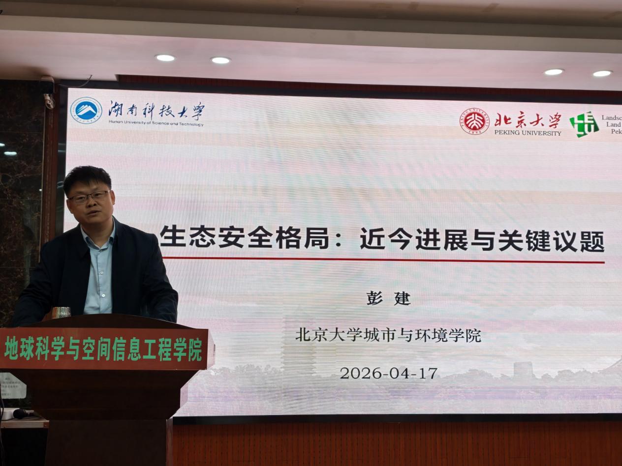 2026年4月17日下午,北京大学博雅特聘教授,教育部长江学者彭建教授应邀做客湖南科技大学“湘江高端学术论坛”,为师生带来题为《生态安全格局:近今进展与关键议题》的学术报告。报告由地球科学与空间信息工程学院院长朱永建主持,学院党委书记余光辉、副院长唐志光、本科生院副院长王欣以及中青年教师和学生参加了本次讲座。